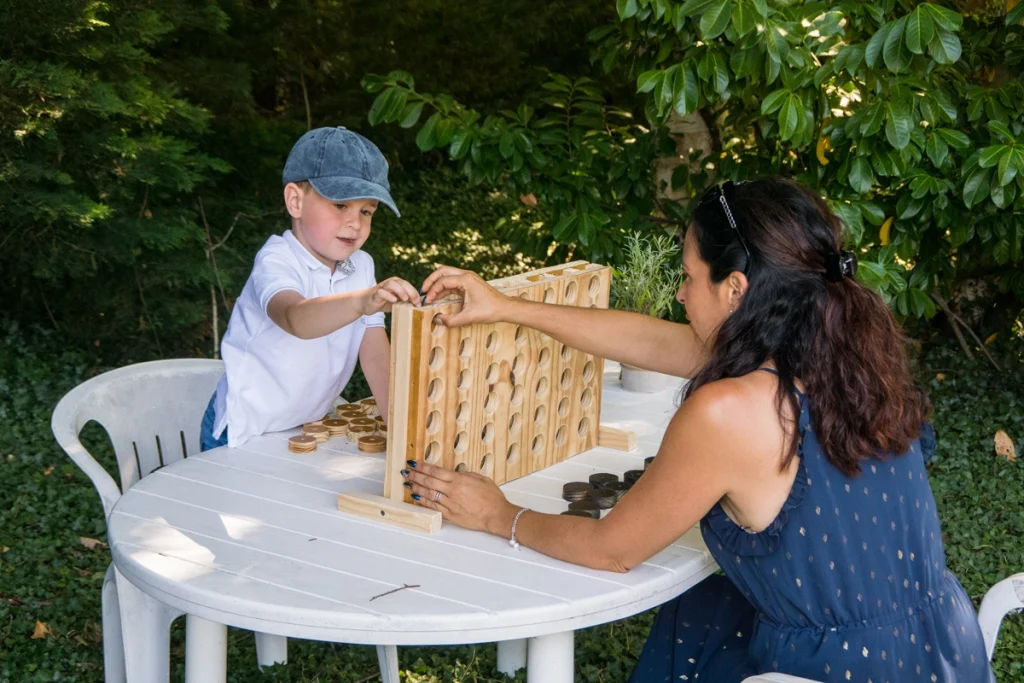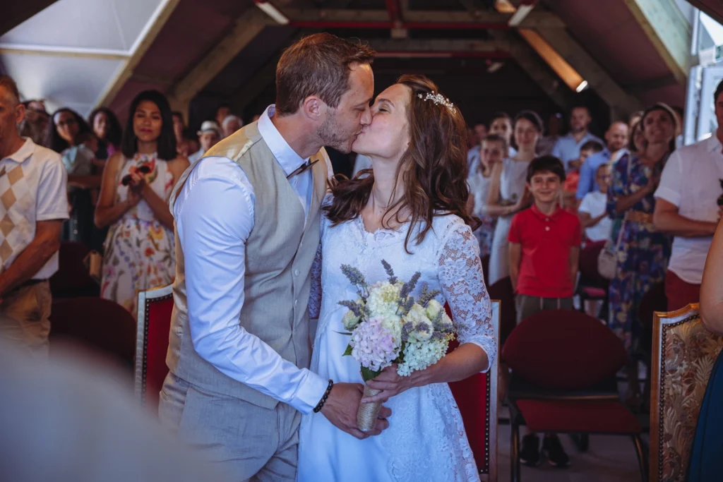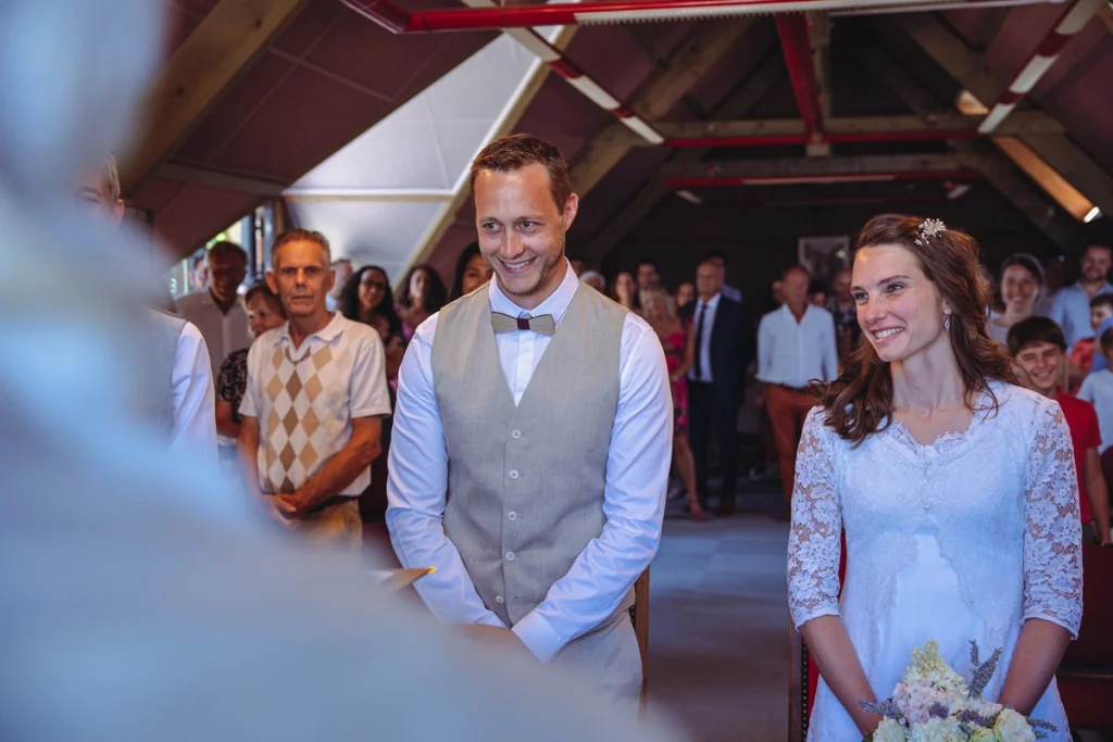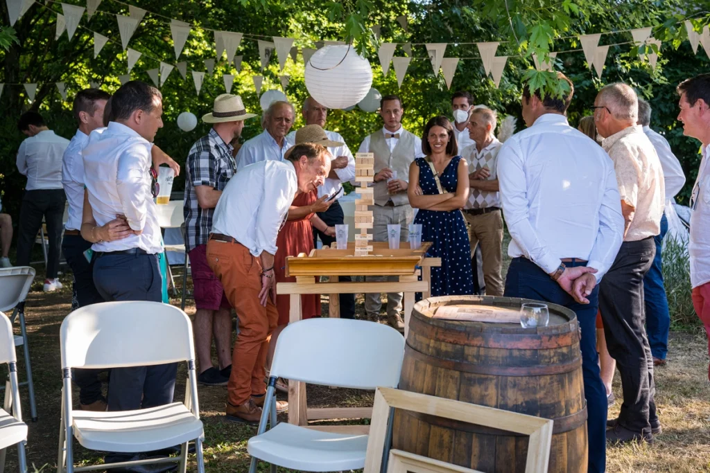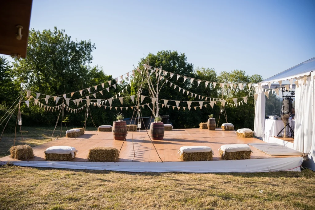 Marie et Matthieu ont imaginé une journée à leur image, sous un beau soleil, avec un grand chapiteau, un parquet en bois, des ballots de paille et des chaises authentiques en paille. Chaises longues et jeux en bois étaient également au rendez-vous pour profiter pleinement de la fête.