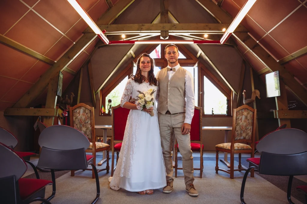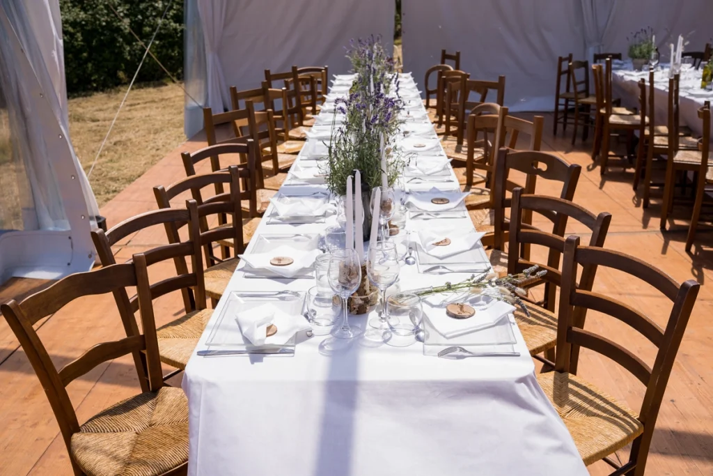 Les invités étaient entourés de décorations naturelles : fleurs sauvages, feuillage et bois brut. Une ambiance simple et chaleureuse, authentique et naturelle, où chaque détail célébrait l’amour et la beauté de la campagne.